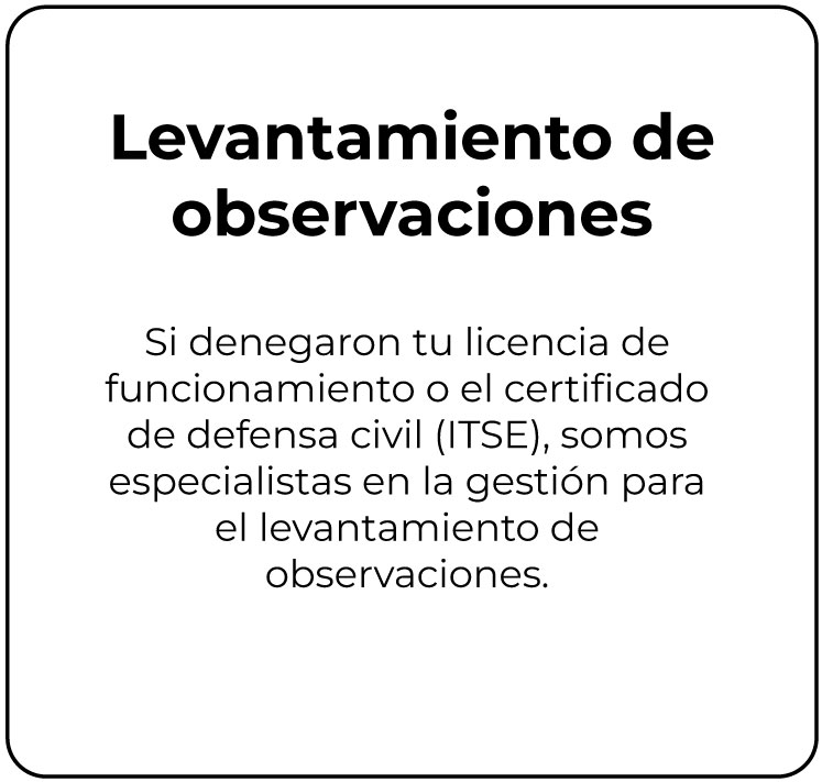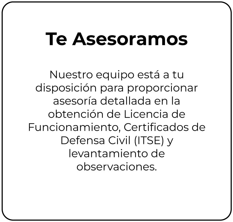 Contamos con un grupo de especialistas con amplia experiencia en la elaboración de expedientes integrales para la obtención de Licencias de funcionamiento, Certificados ITSE en Edificaciones (Defensa Civil), entre otros. A la fecha el 100% de nuestros clientes han logrado obtener sus respectivos certificados con plazos y resultados satisfactorios, en base a nuestra asesoría y gestión.
